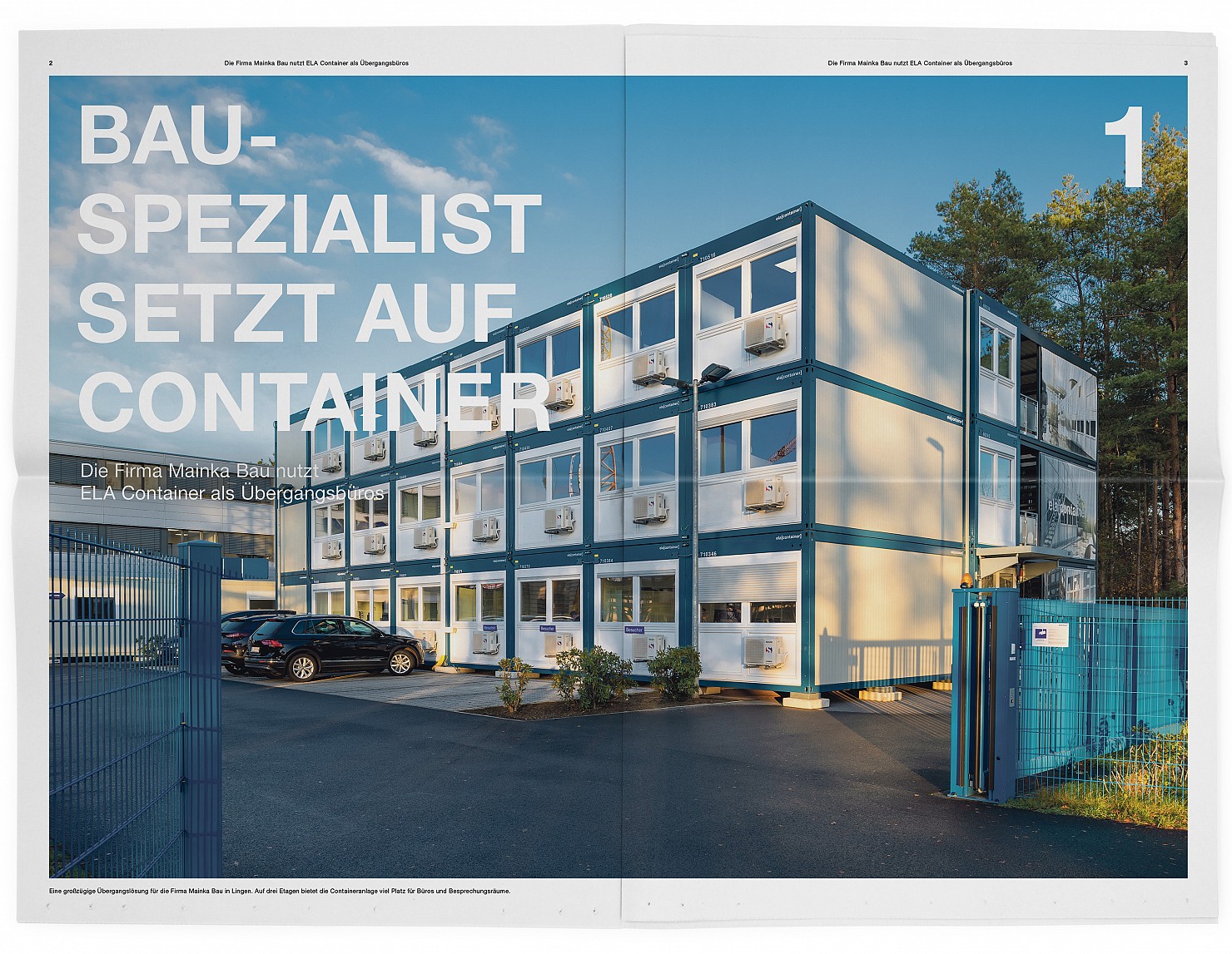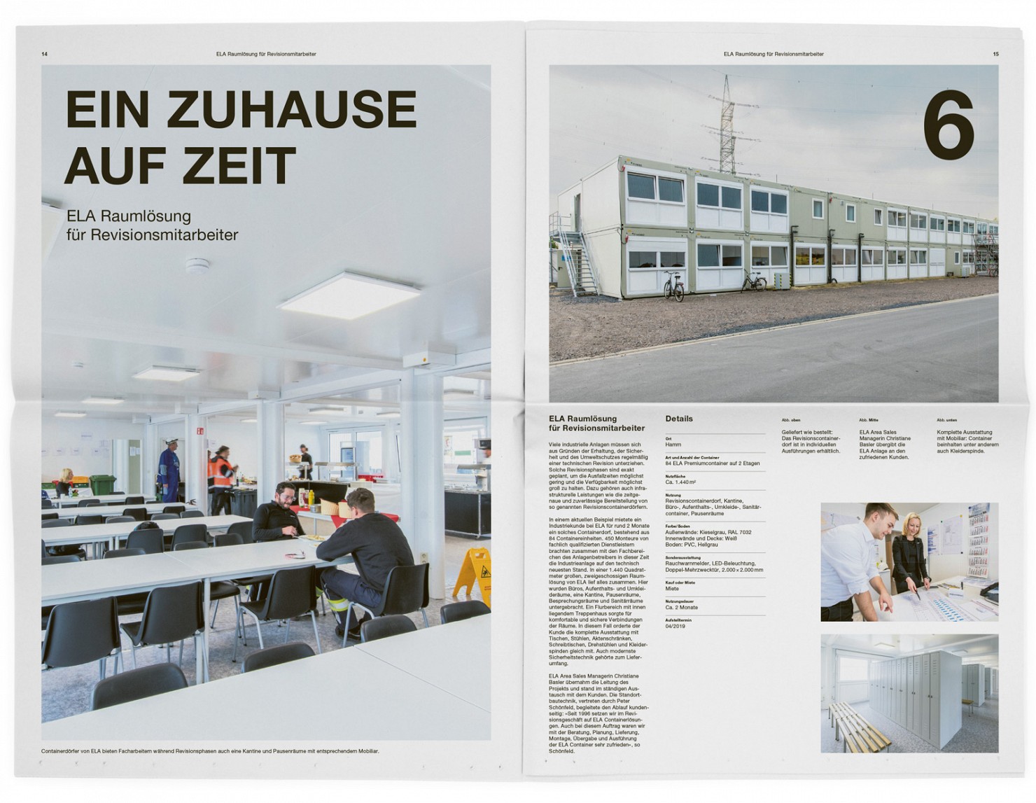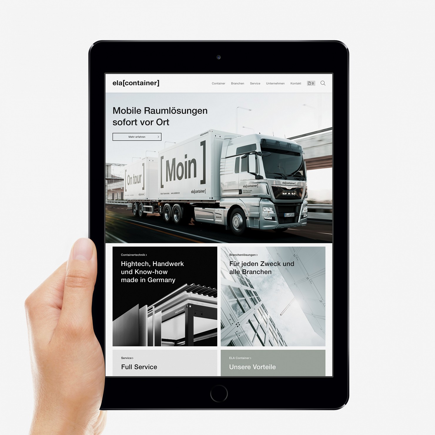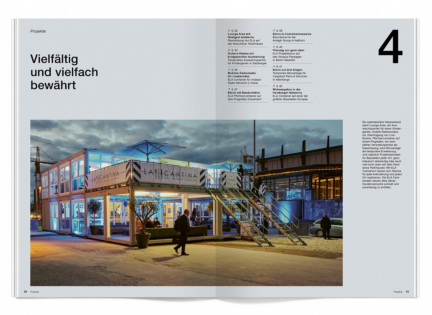 2012 beauftragte uns ELA Container, einer der führenden internationalen Produzenten und Dienstleister von mobilen Raumlösungen in Containerbauweise mit der Entwicklung einer neuen visuellen Identität. Seitdem arbeiten wir kontinuierlich mit dem Unternehmen zusammen an der Konzeption und Ausarbeitung der verschiedenen Medien. Mit 30.000 Containern, 850 Mitarbeitern und 15 Standorten weltweit hat sich ELA Container in Deutschland zu einem der führenden Anbieter von hochwertigen und flexiblen Raummodulen entwickelt.