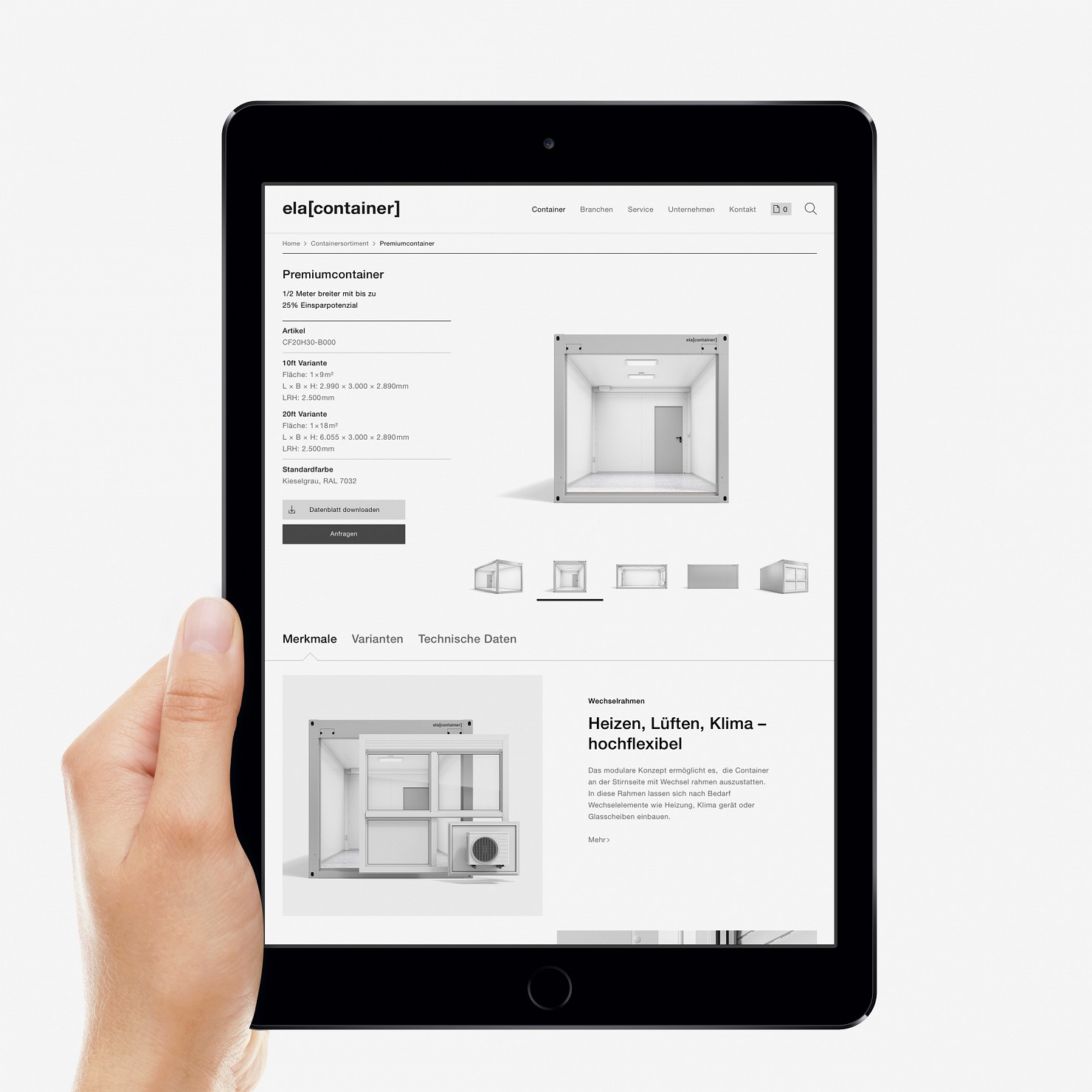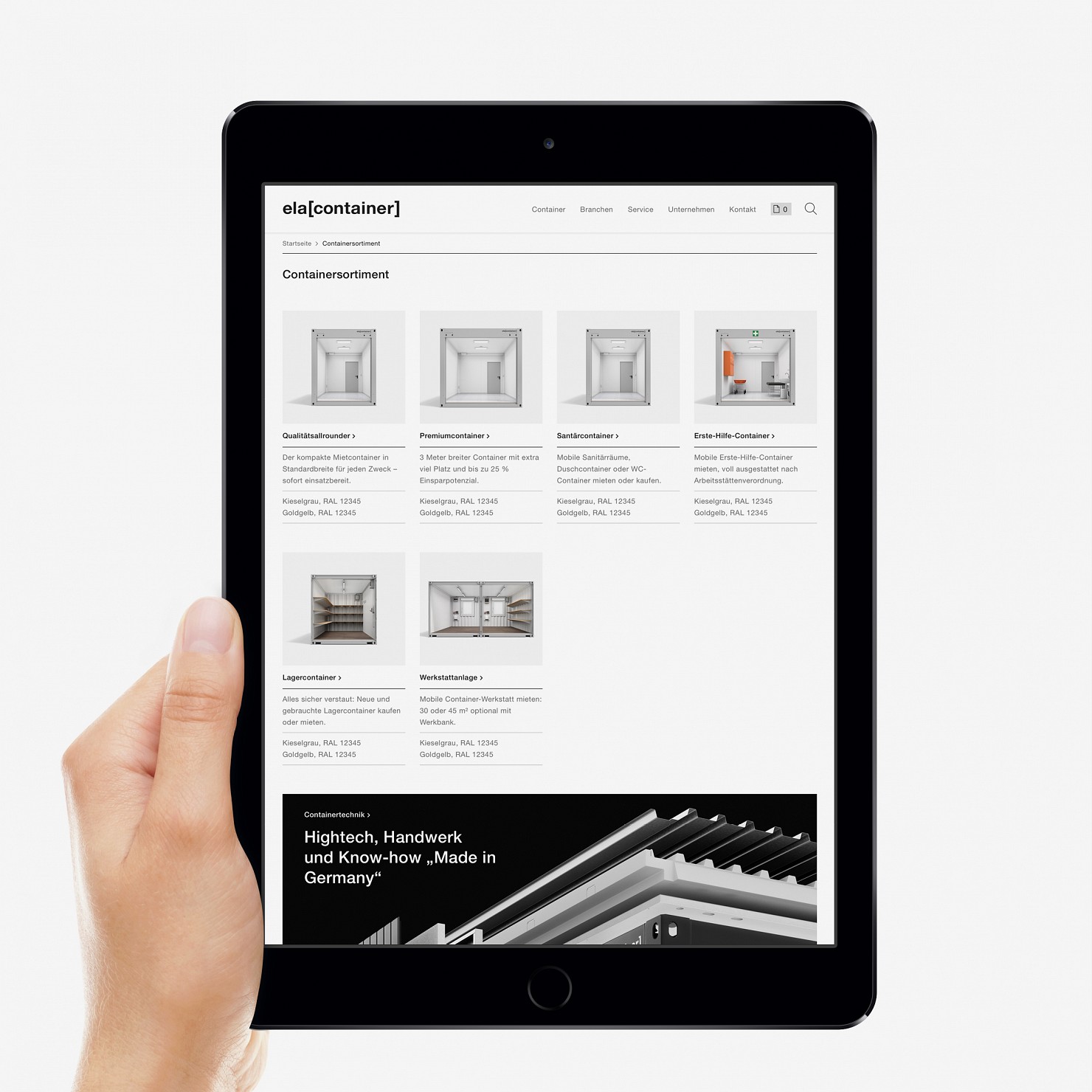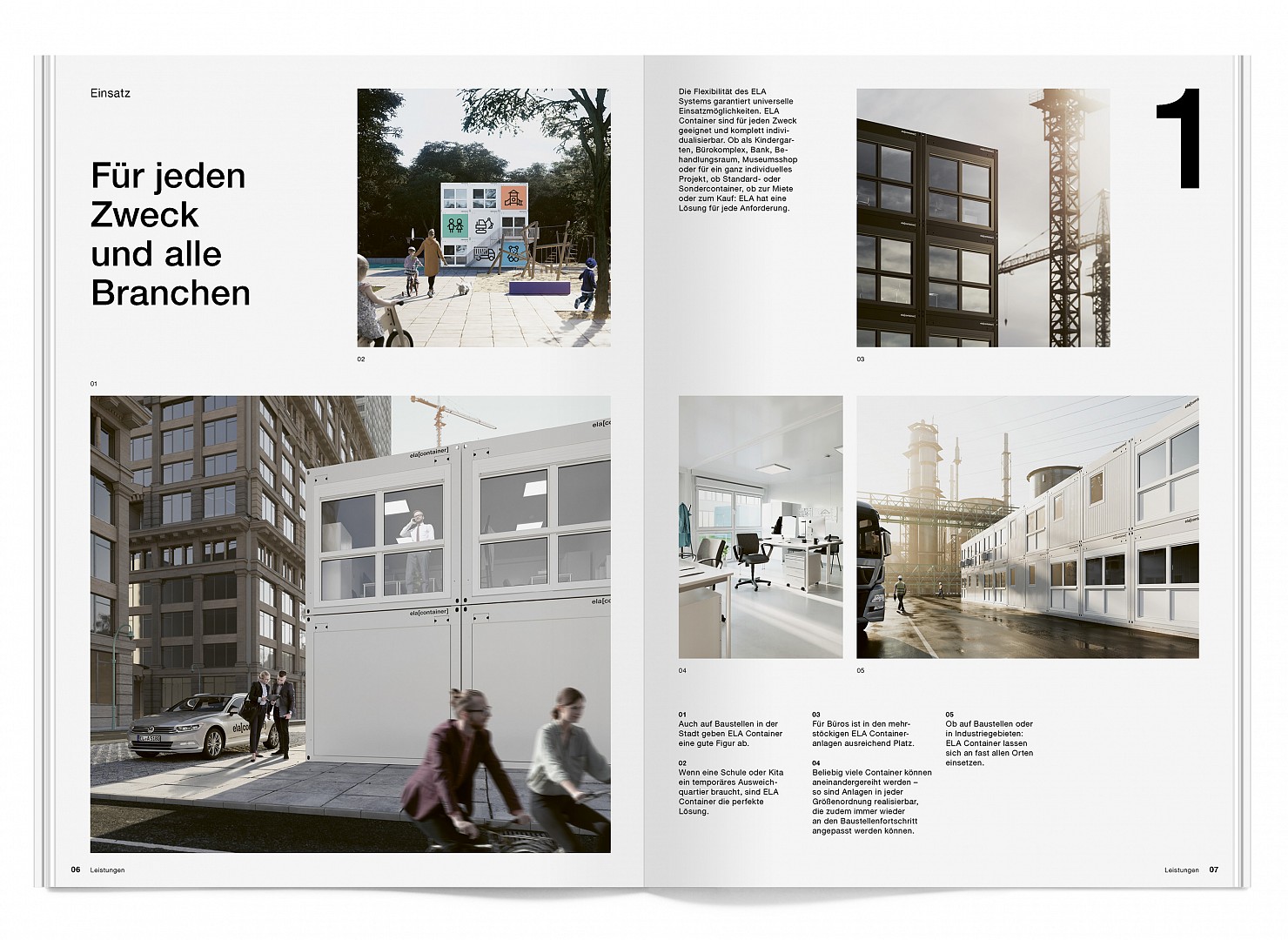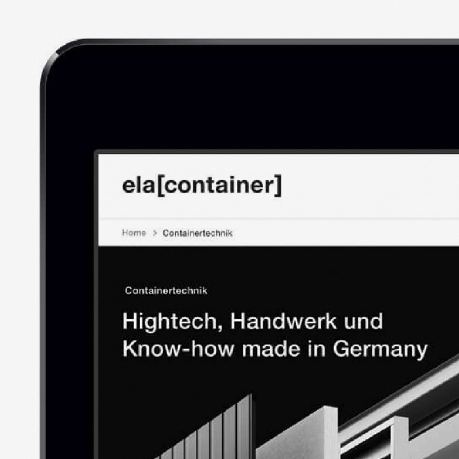 2012 beauftragte uns ELA Container, einer der führenden internationalen Produzenten und Dienstleister von mobilen Raumlösungen in Containerbauweise mit der Entwicklung einer neuen visuellen Identität. Seitdem arbeiten wir kontinuierlich mit dem Unternehmen zusammen an der Konzeption und Ausarbeitung der verschiedenen Medien. Mit 30.000 Containern, 850 Mitarbeitern und 15 Standorten weltweit hat sich ELA Container in Deutschland zu einem der führenden Anbieter von hochwertigen und flexiblen Raummodulen entwickelt.