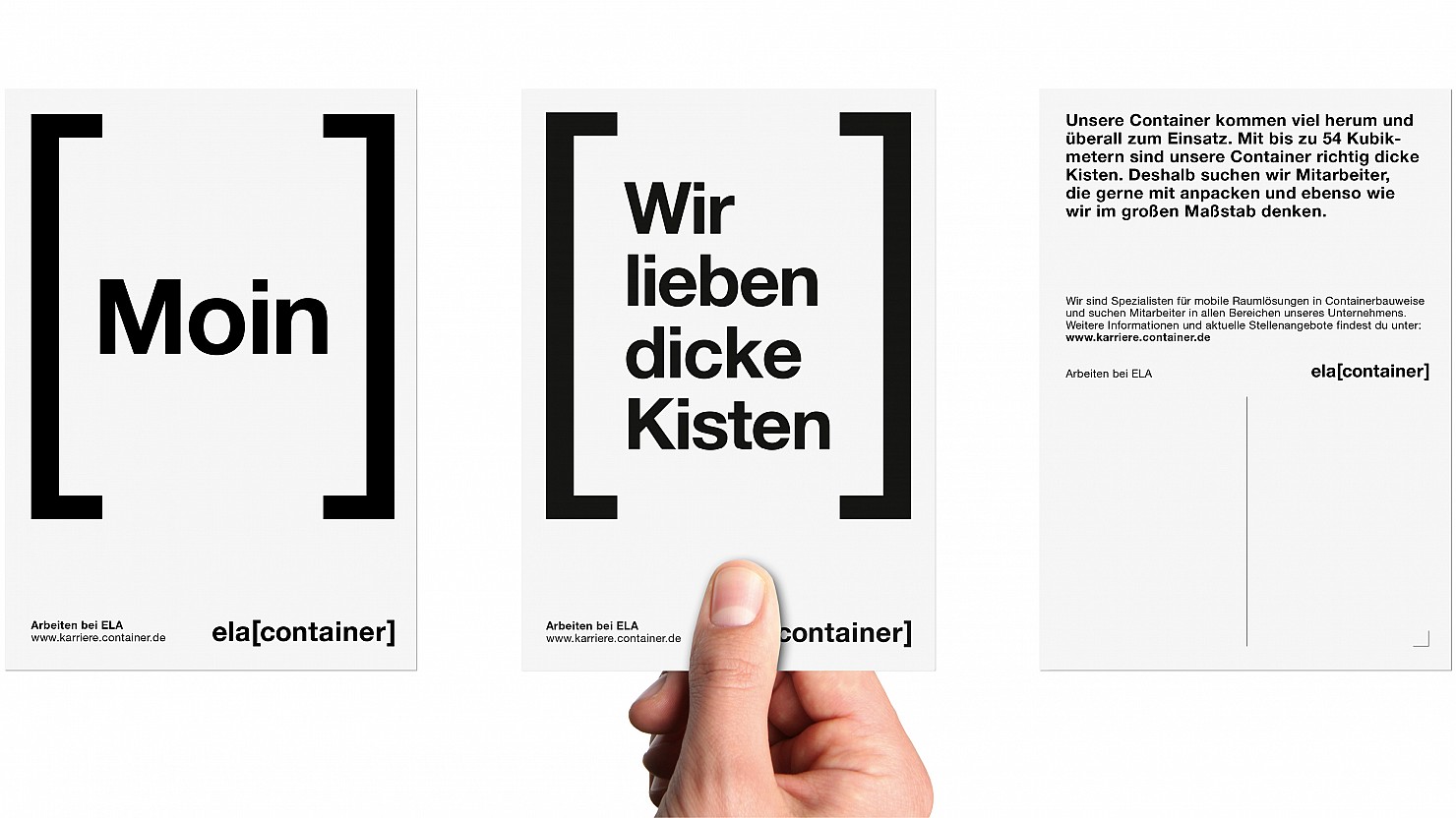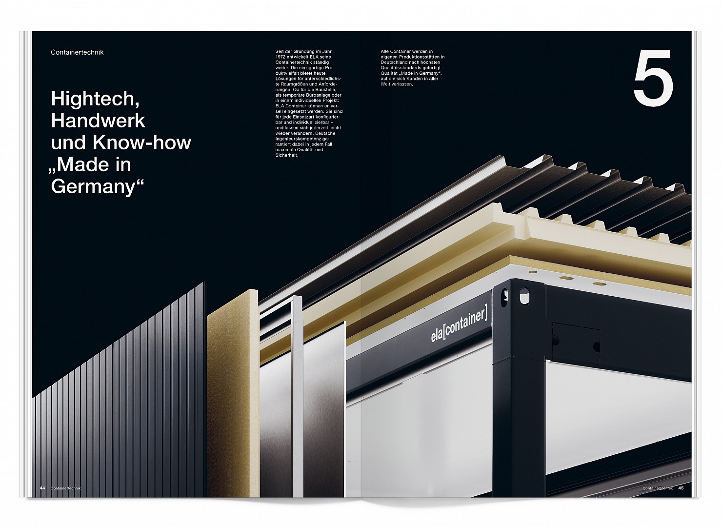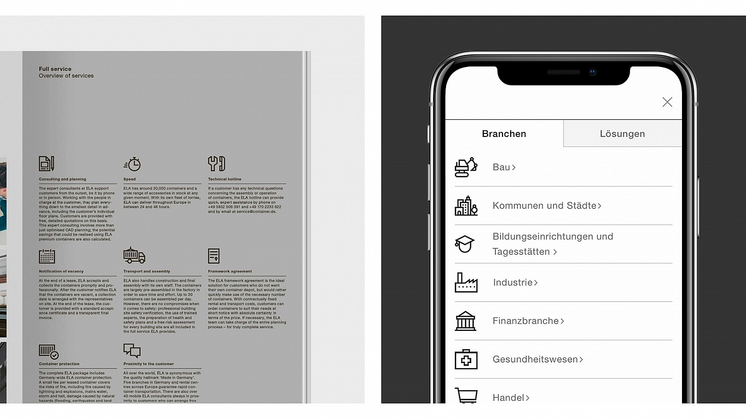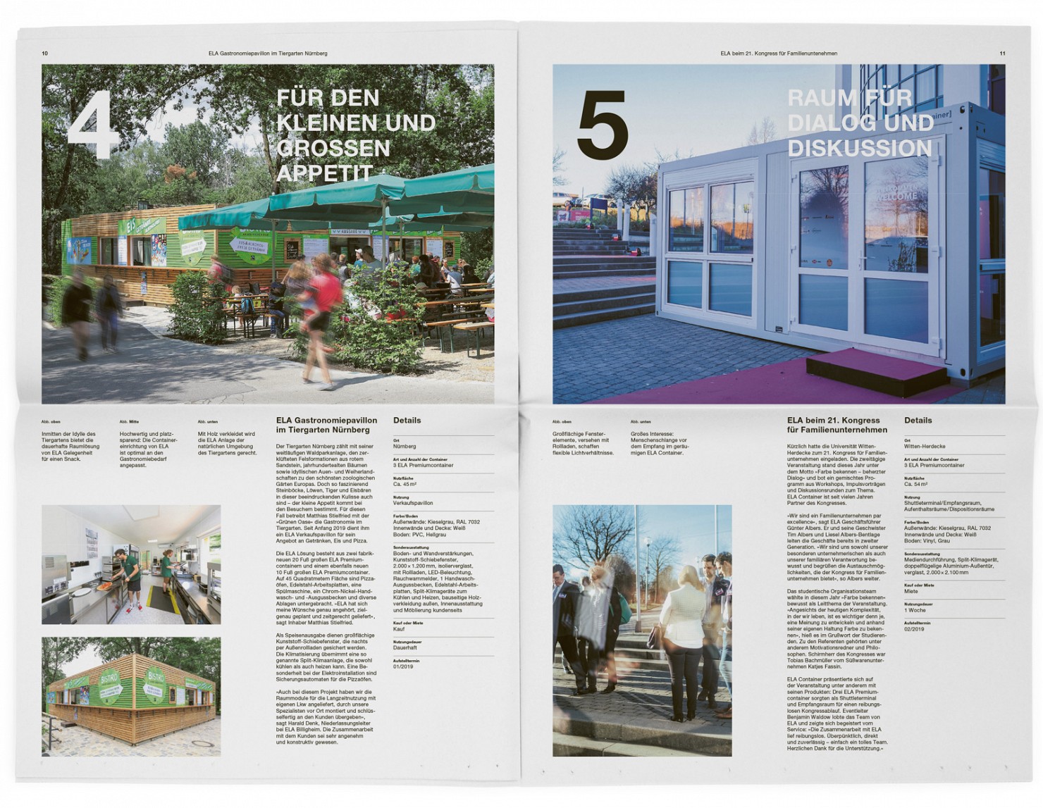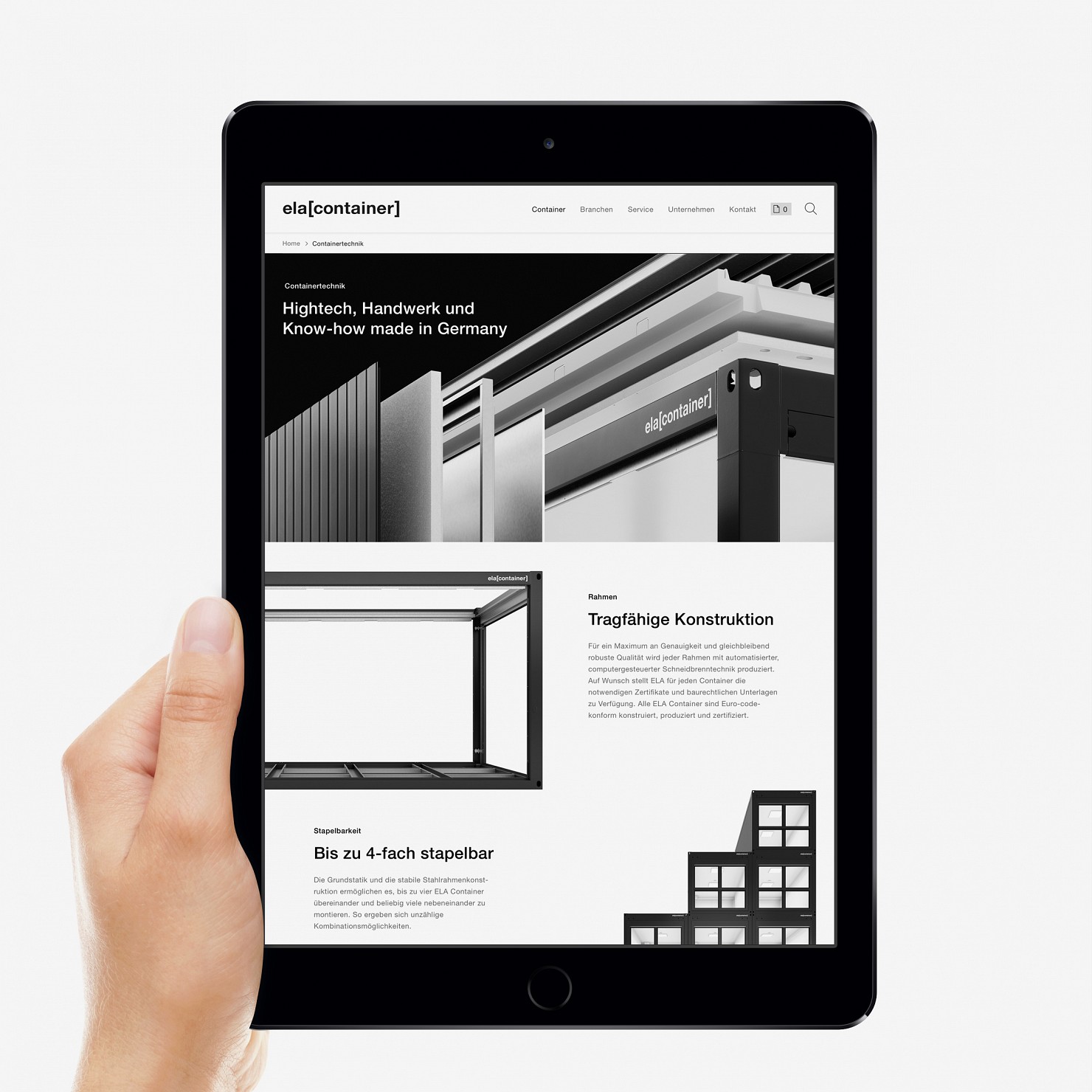 2012 beauftragte uns ELA Container, einer der führenden internationalen Produzenten und Dienstleister von mobilen Raumlösungen in Containerbauweise mit der Entwicklung einer neuen visuellen Identität. Seitdem arbeiten wir kontinuierlich mit dem Unternehmen zusammen an der Konzeption und Ausarbeitung der verschiedenen Medien. Mit 30.000 Containern, 850 Mitarbeitern und 15 Standorten weltweit hat sich ELA Container in Deutschland zu einem der führenden Anbieter von hochwertigen und flexiblen Raummodulen entwickelt.