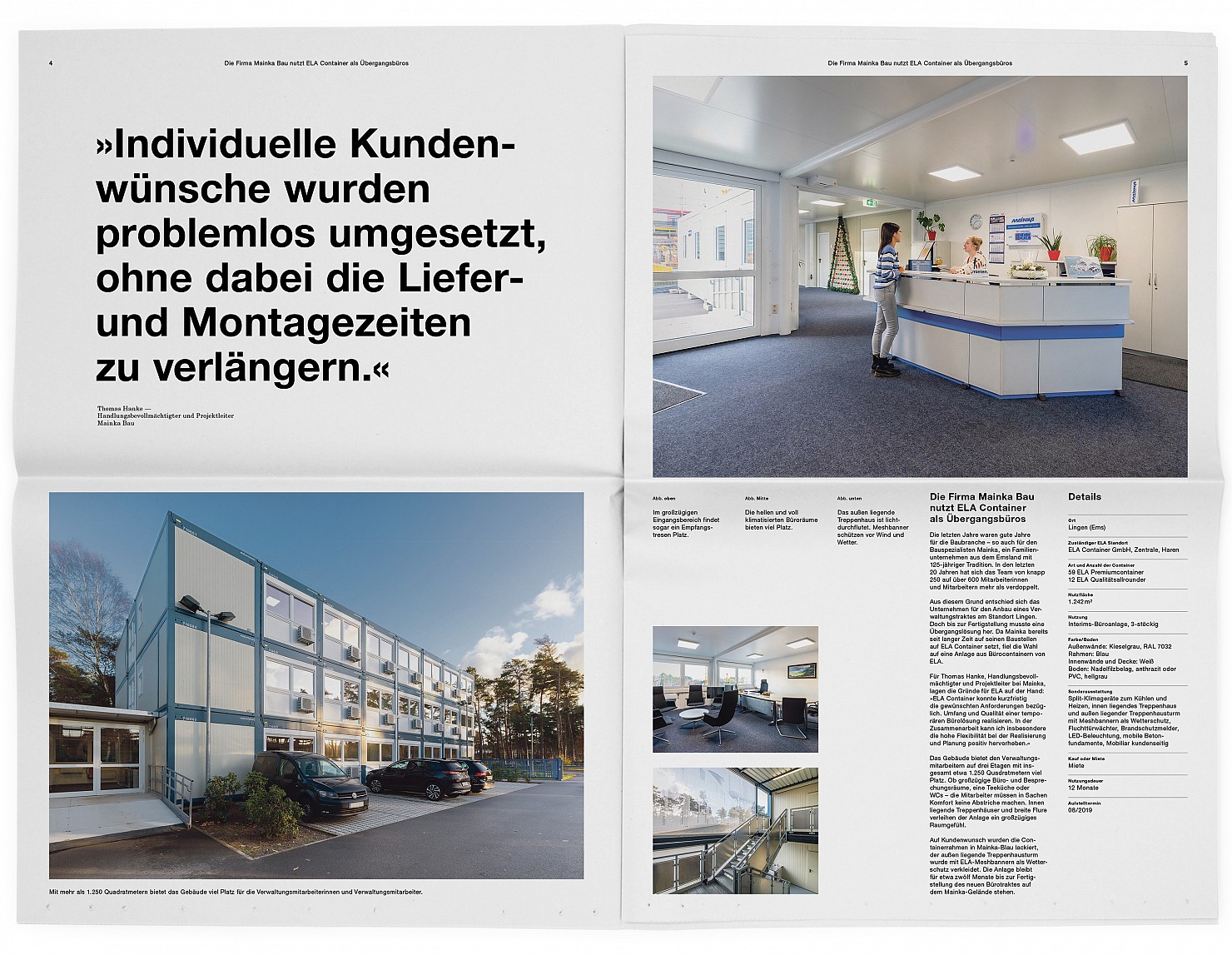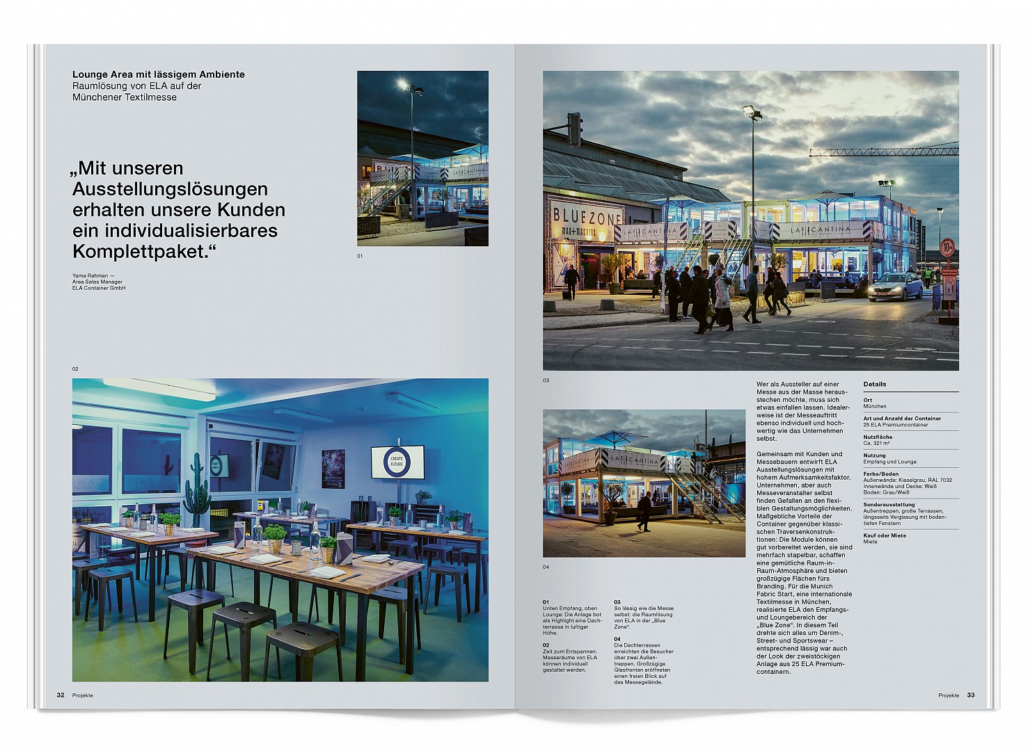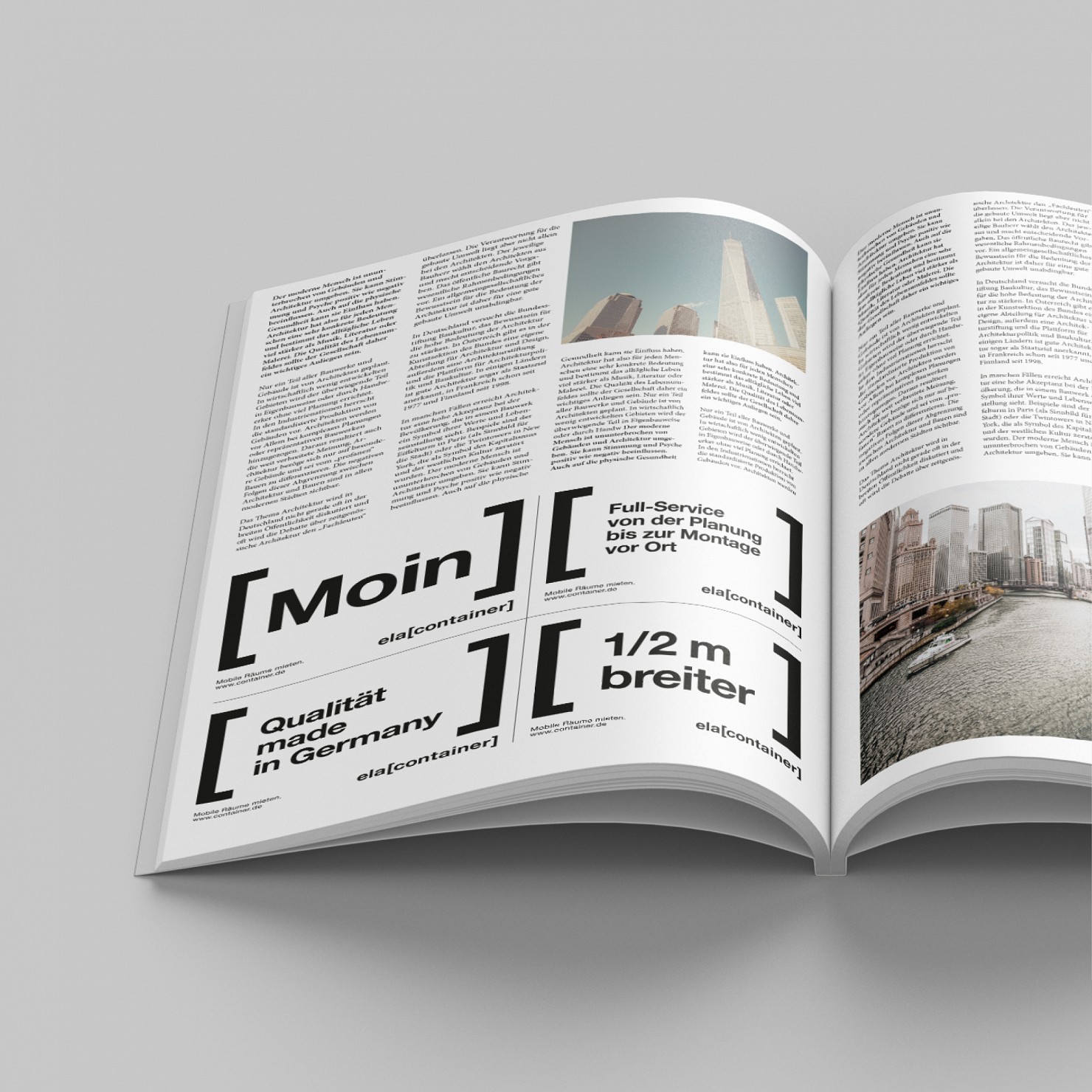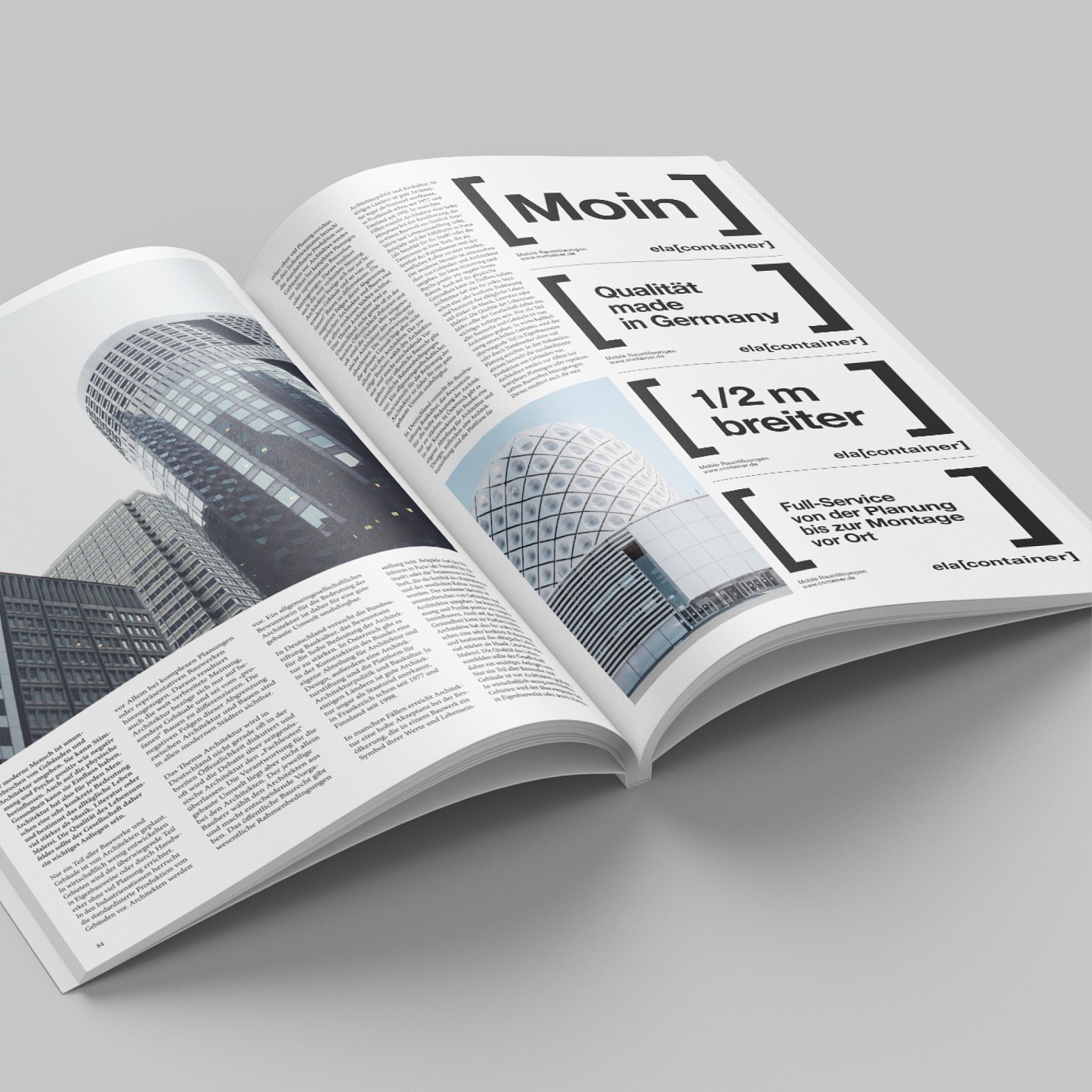 2012 beauftragte uns ELA Container, einer der führenden internationalen Produzenten und Dienstleister von mobilen Raumlösungen in Containerbauweise mit der Entwicklung einer neuen visuellen Identität. Seitdem arbeiten wir kontinuierlich mit dem Unternehmen zusammen an der Konzeption und Ausarbeitung der verschiedenen Medien. Mit 30.000 Containern, 850 Mitarbeitern und 15 Standorten weltweit hat sich ELA Container in Deutschland zu einem der führenden Anbieter von hochwertigen und flexiblen Raummodulen entwickelt.