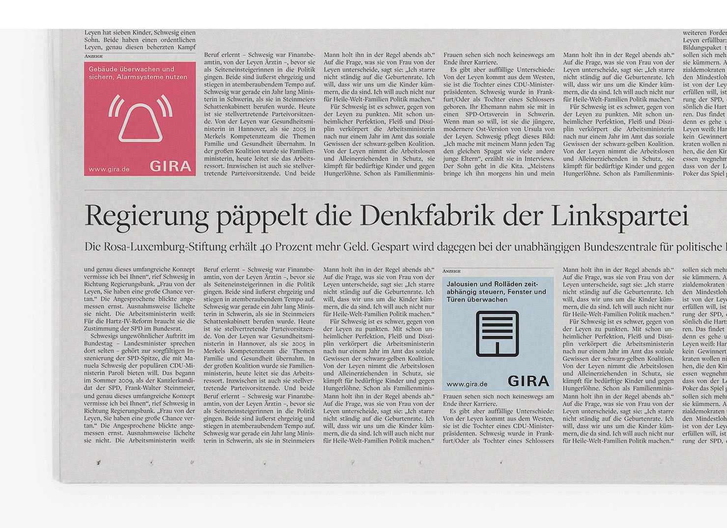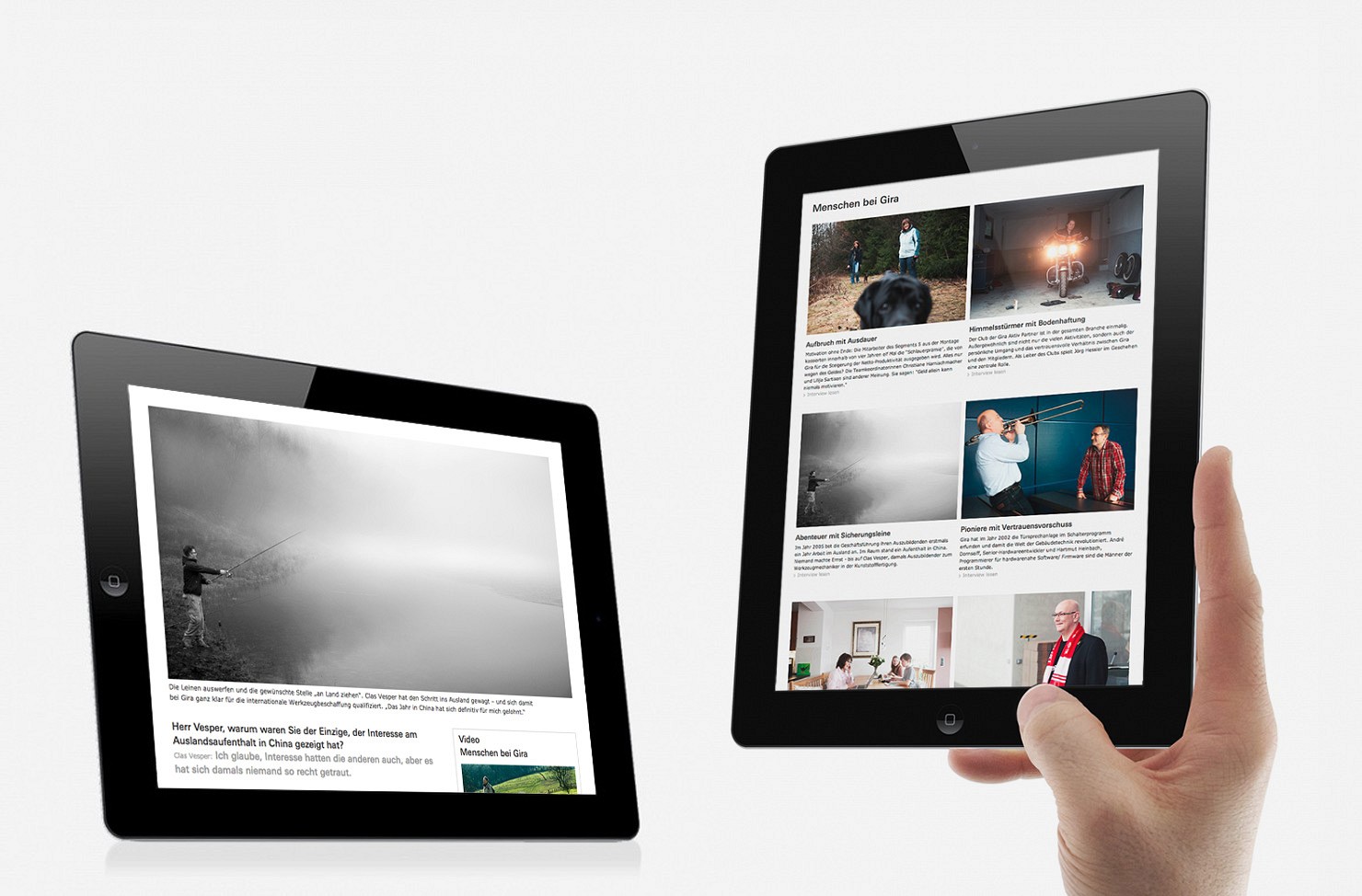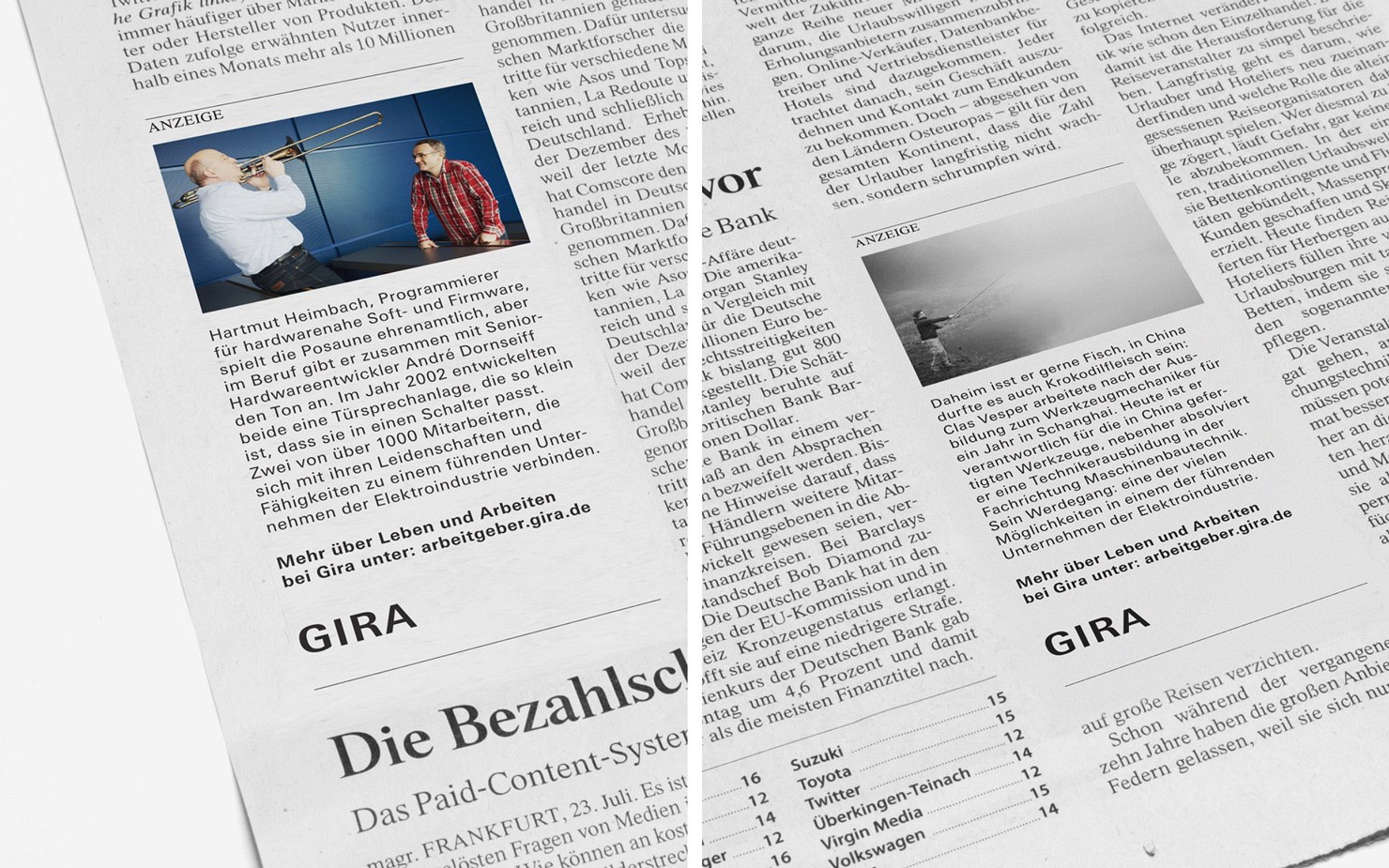 Konzeption einer umfassenden Kommunikationsstrategie für Gira als Arbeitgeber, in der Gira Mitarbeiter abbgebildet und interviewt werden. Die umfangreichen Portraitserien wurden von uns konzipiert und in der Umsetzung betreut. Die Gira Arbeitgeber-Kommunikation umfasst Broschüren, ein digitales Arbeitgeberportal sowie eine Kampagne mit Textteilanzeigen in Tageszeitungen.