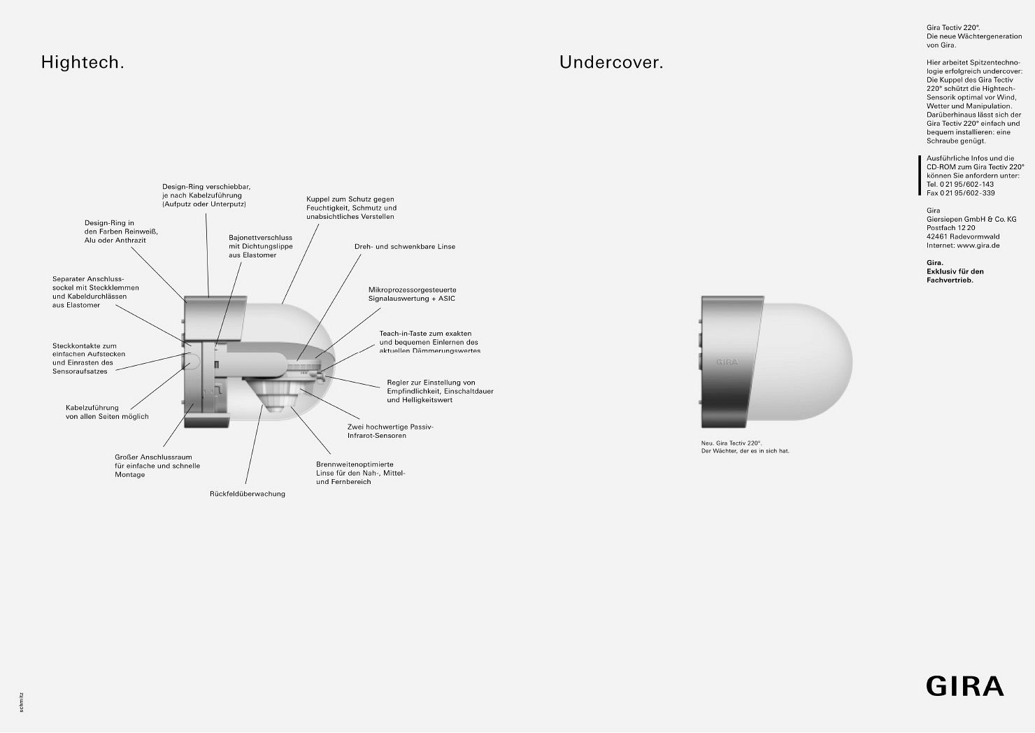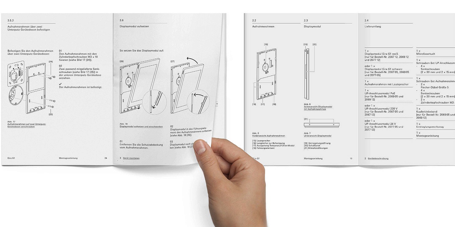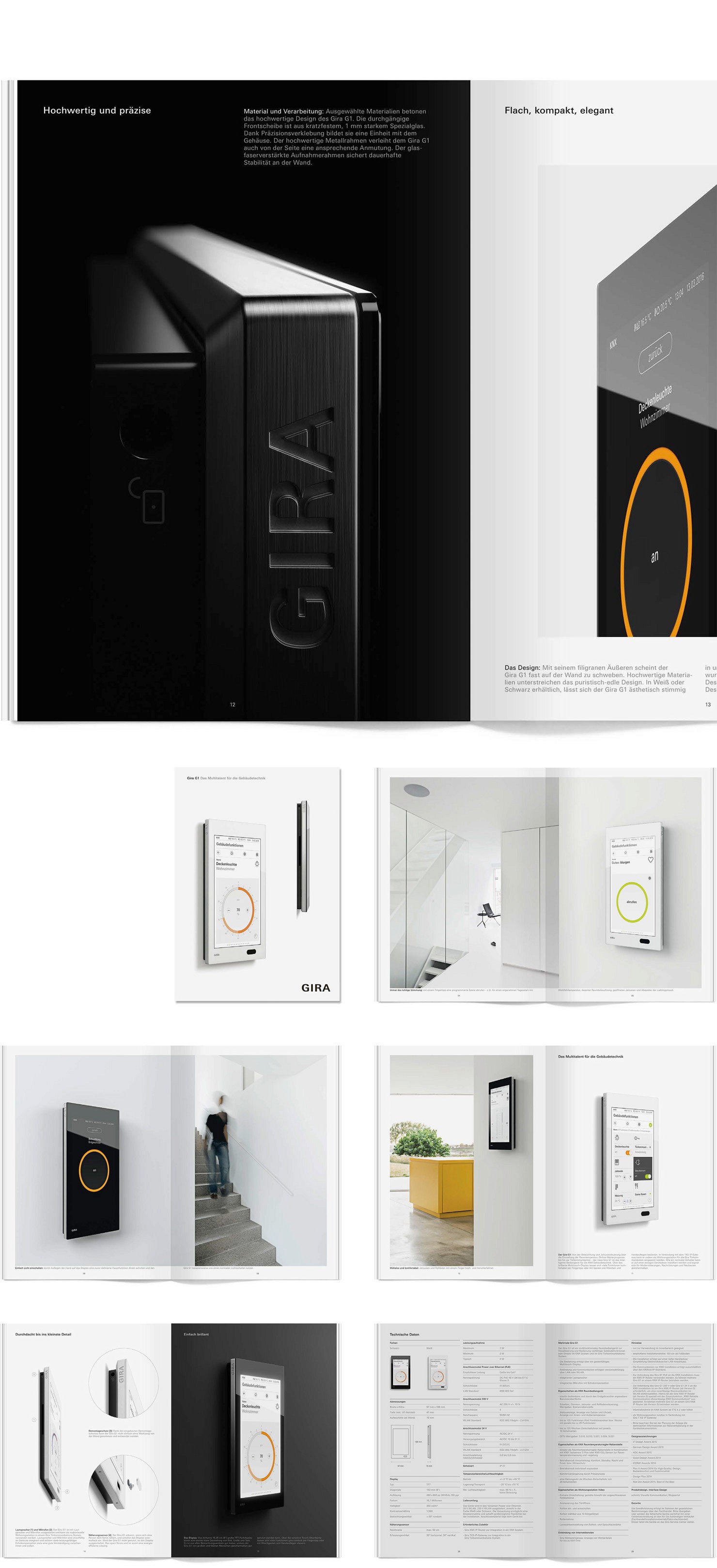 Trotz umfangreicher Präsentation im Internet: eine Broschüre ist nach wie vor ein entscheidender Imageträger, steigert die Exklusivität der Marke und ist daneben praktisch im Handling. Die Broschüre zum Gira G1 präsentiert das Produkt umfassend und Zielgruppen übergreifend. Bauherren, Architekten und Elektroinstallateure werden ausführlich über die Features, Anwendungsbereiche und technischen Details von der Montage bis hin zur Inbetriebnahme des Gerätes informiert.