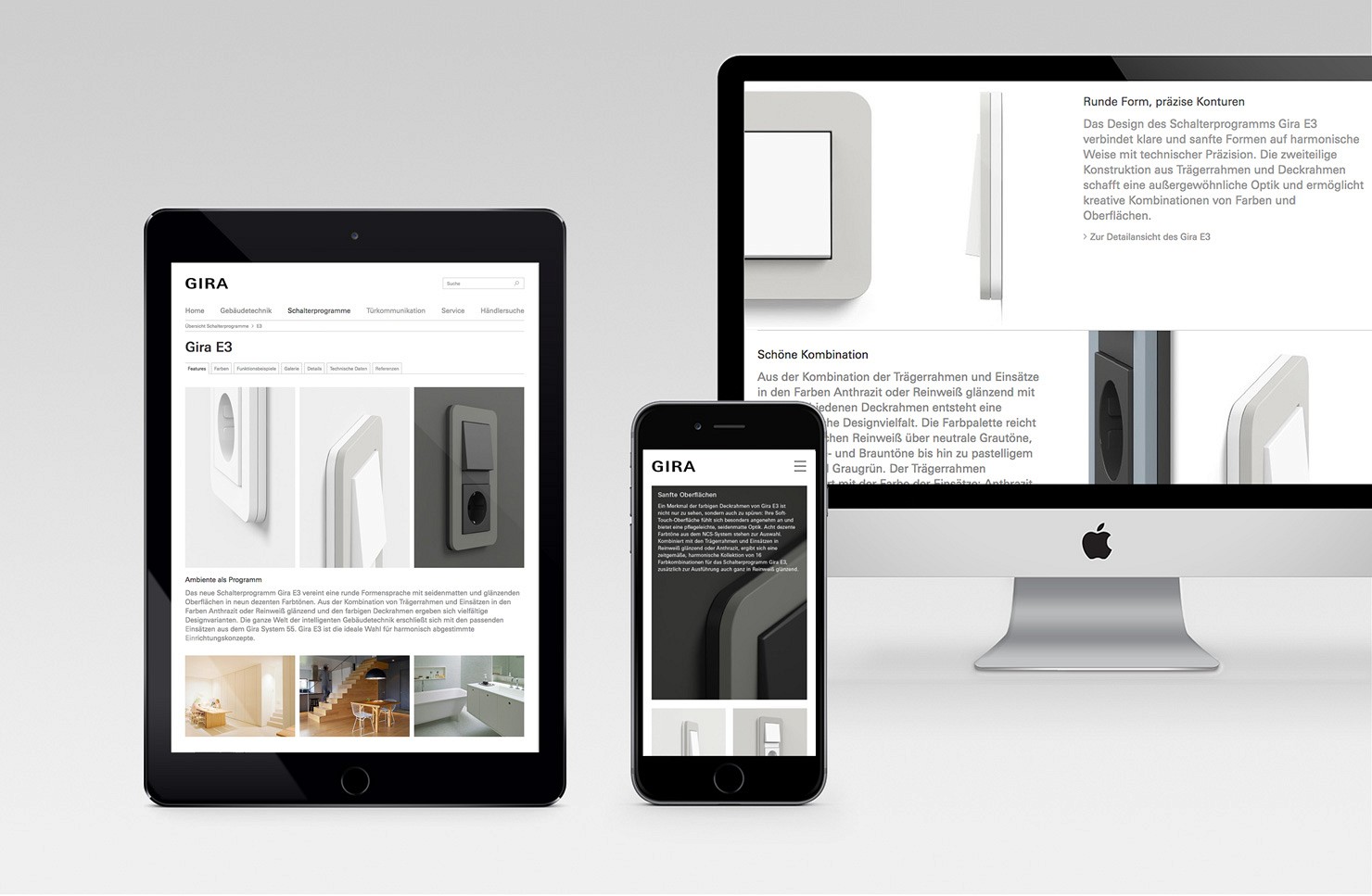 Das digitale Markenerlebnis ist heute einer der wichtigsten Bestandteile der Corporate Identity. Websites, Apps und soziale Medien sind für Kunden meist der erste Berührungspunkt zum Unternehmen und zu deren Produkten. Eine klare und sorgfältige Gestaltung hilft Kunden, sich schnell zu orientieren und umfassend zu informieren. Im Fall von Gira spiegelt sie gleichzeitig die zentralen Unternehmenswerte wie Einfachheit, Transparenz und Wertigkeit wider. Für Gira haben wir die Website, Webfilme, Produktkonfiguratoren und Augmented Reality Präsentationen konzipiert und gestaltet.