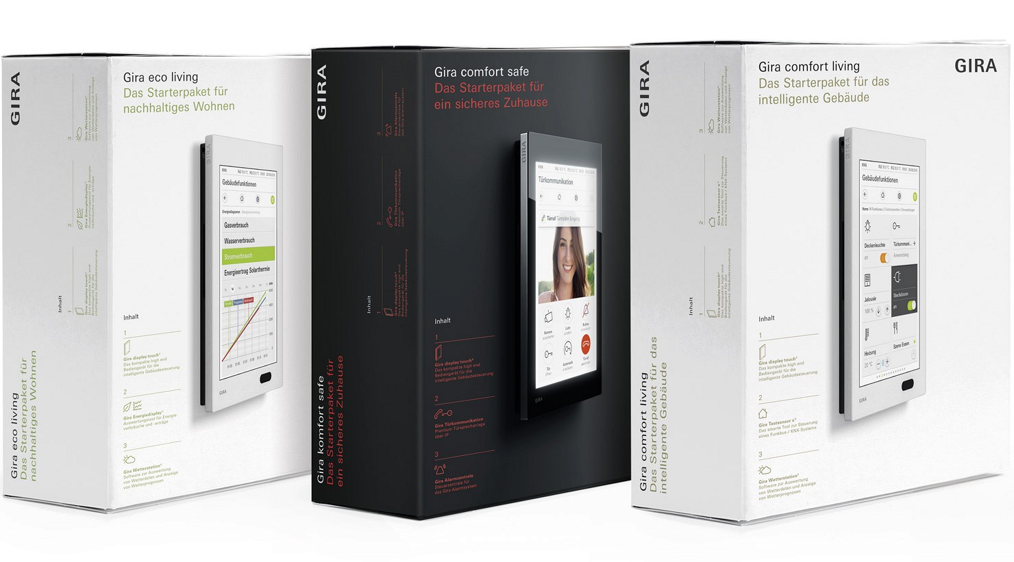Für den Gira G1, der viele unterschiedliche Funktionen wie Gebäudesteuerung, Türsprechanlage, Alarmzentrale oder eine Verbrauchsauswertung in sich vereint, haben wir Vermarktungspakete entworfen, die die Themen Sicherheit, Energiesparen und Komfort erkennbar positionieren.