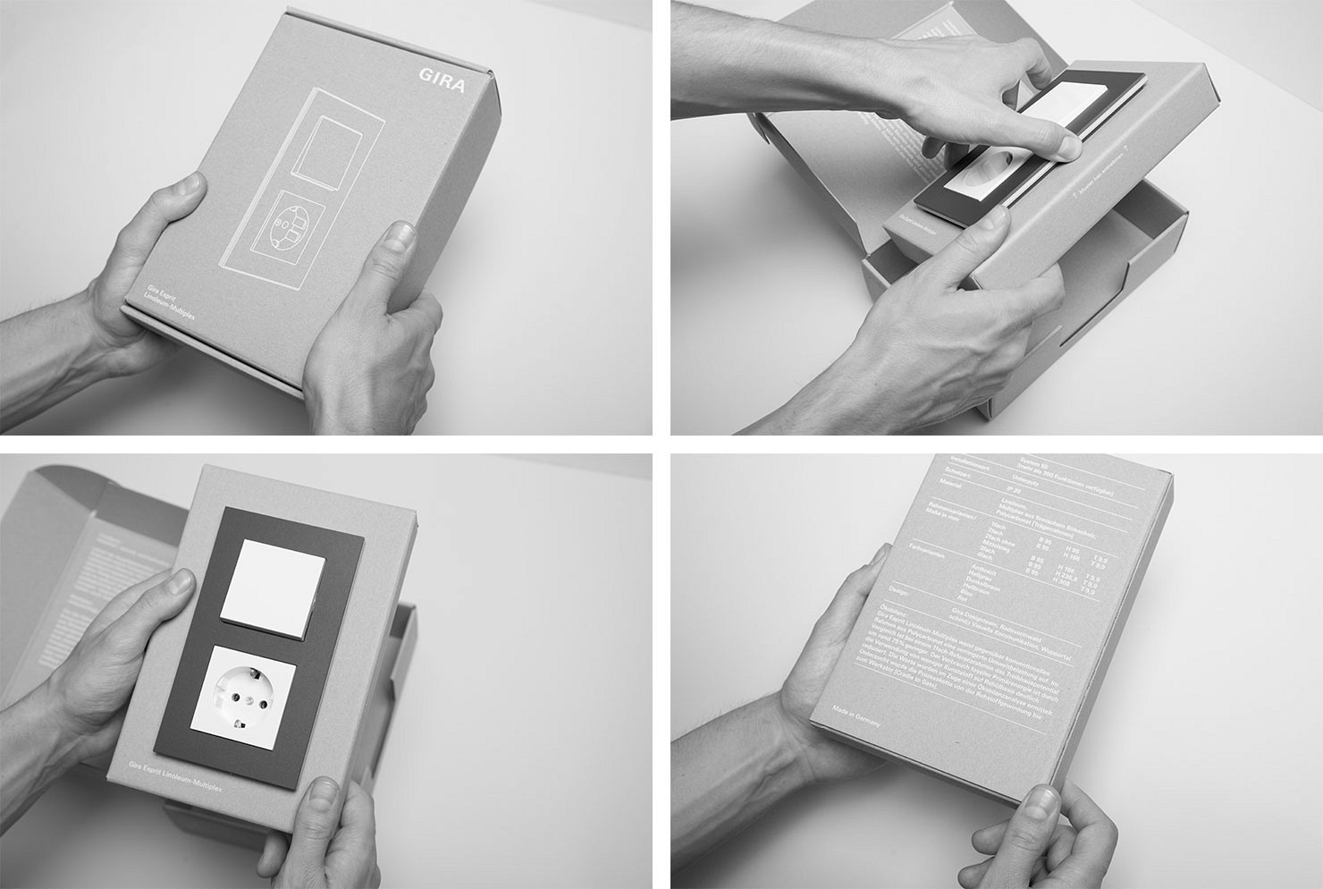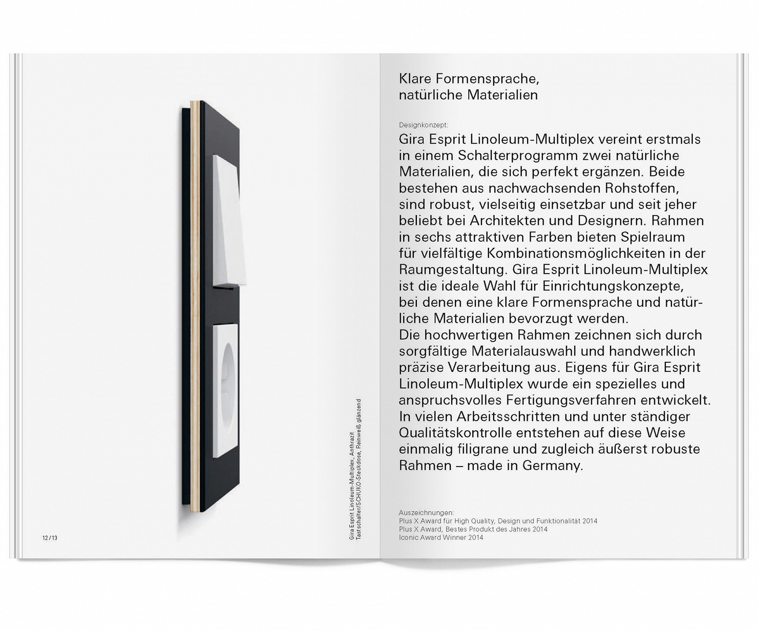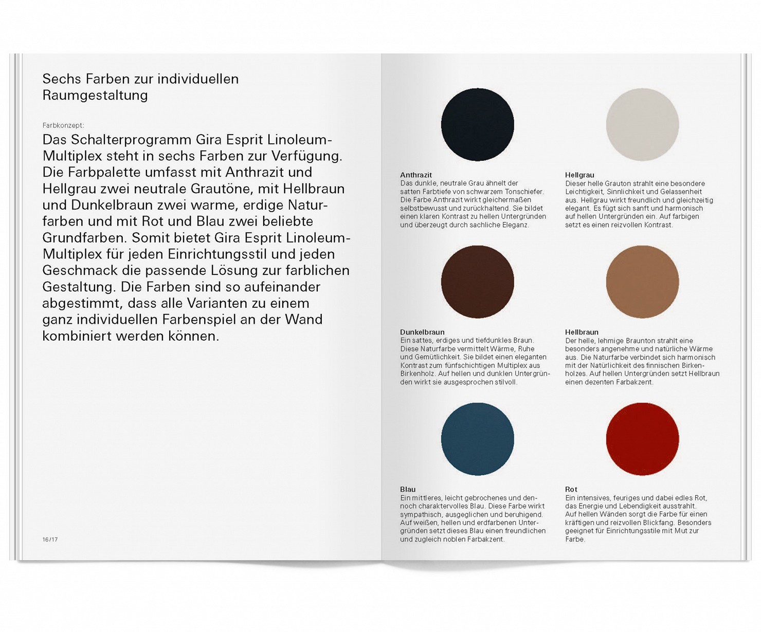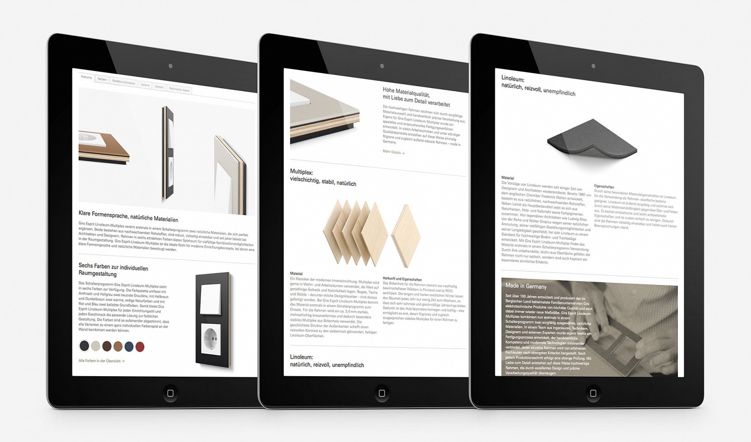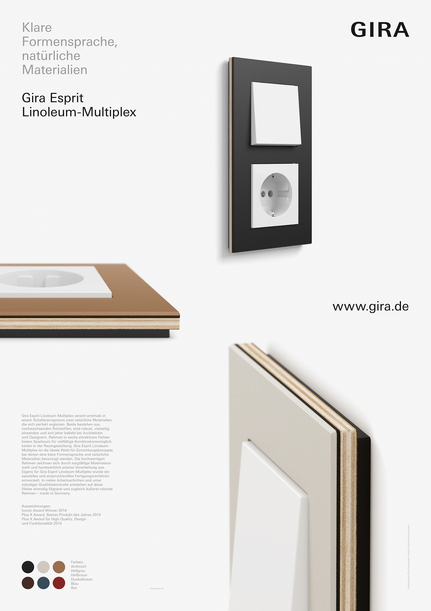 Für das Schalterprogramm Gira Esprit-Linoleum-Multiplex haben wir eine charakteristische Produktidentität für die Kommunikation entwickelt und verschiedene Medien gestaltet, wie beispielsweise Anzeigen, Broschüre, Poster, Website, Webclips u.v.m.